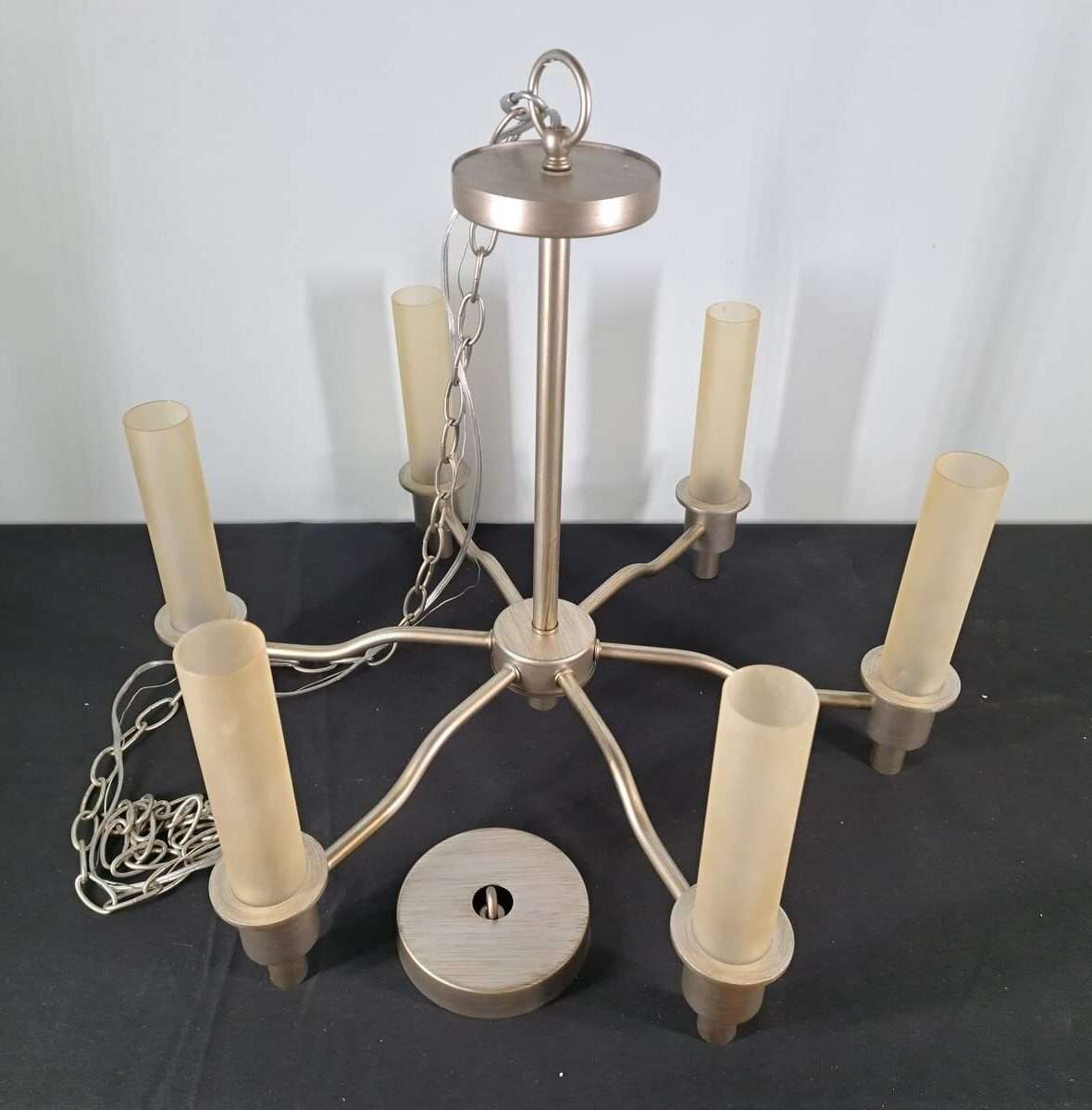 Everything pictured is included in the box, including the hanging chain and ceiling canopy. 6 E12 Bulbs required (not included).