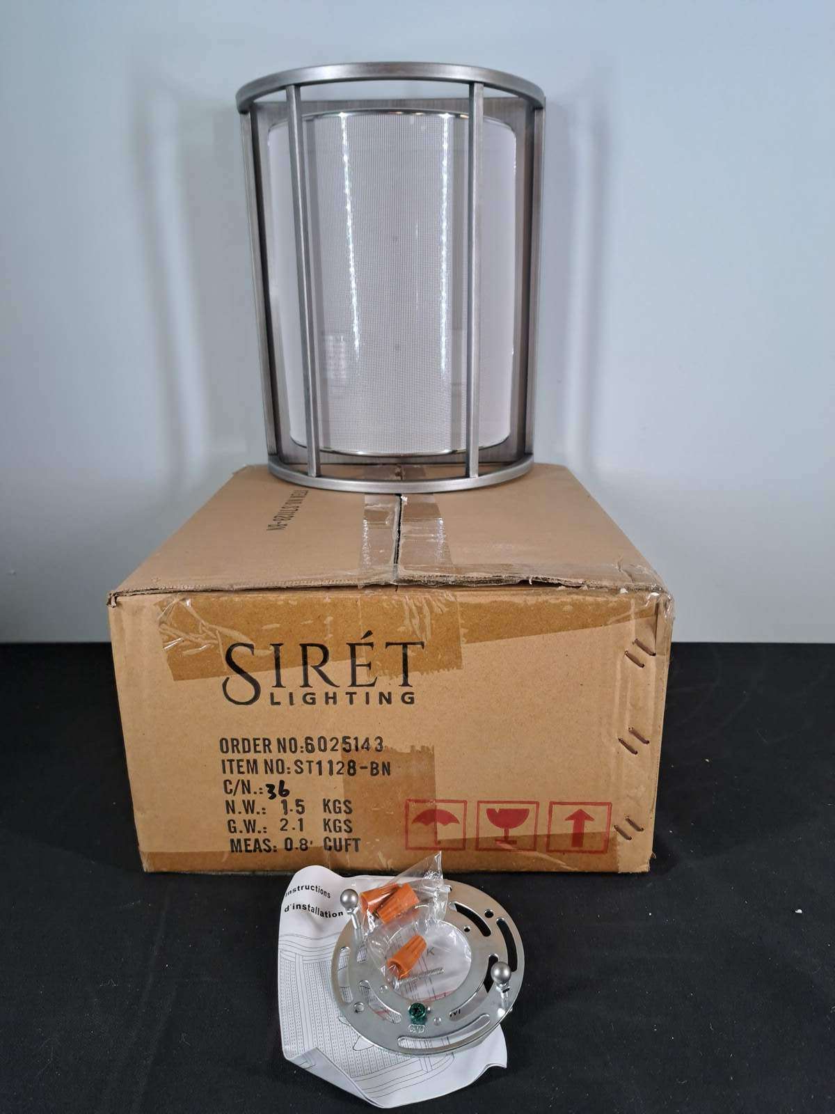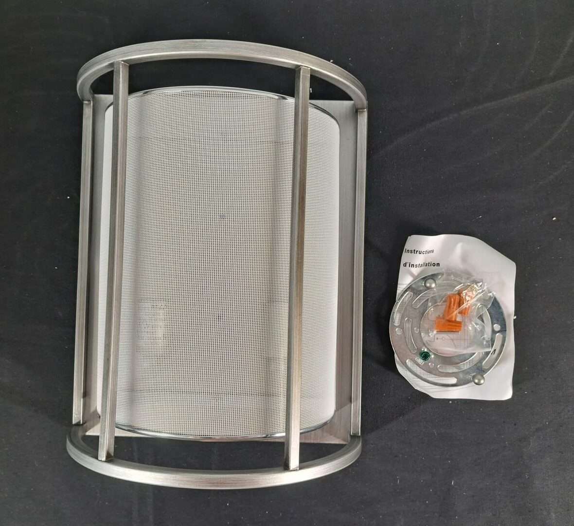 Modern brushed-nickel wall light fixture with a curved “cage” frame and an inner cylindrical diffuser/shade for a clean, softened glow. Designed for a hardwired install (mounting plate included).